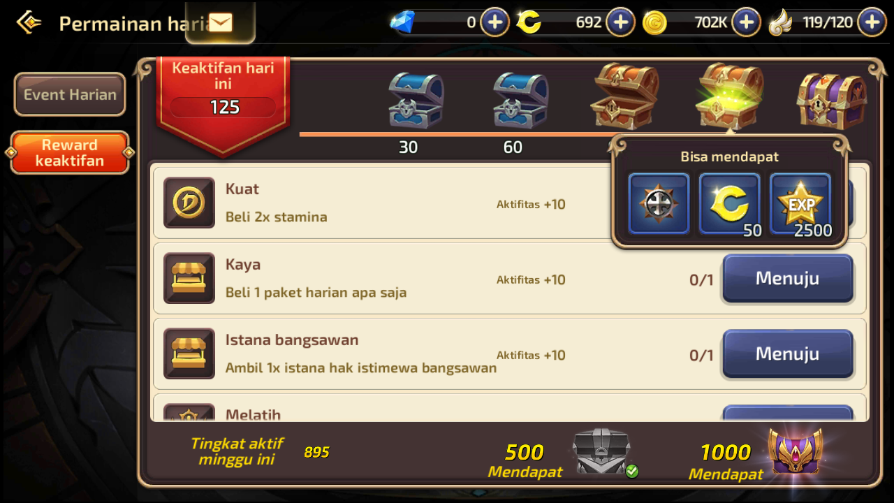 Setiap hari kamu akan mendapatkan misi keaktivan yang harus dikerjakan. Tentunya misi ini menilai seberapa aktif kamu dalam bermain game ini. Terdapat misi tertentu untuk menyelesaikan misi ini. Setiap misi yang kamu selesaikan nantinya akan mendapatkan tambahan poin aktif. Poin ini nantinya bisa kamu gunakan untuk membuka kotak hadiah yang disediakan.
